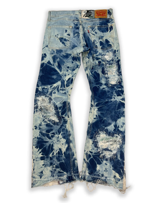 Abstract Blue Floral Bleached Flared Denim