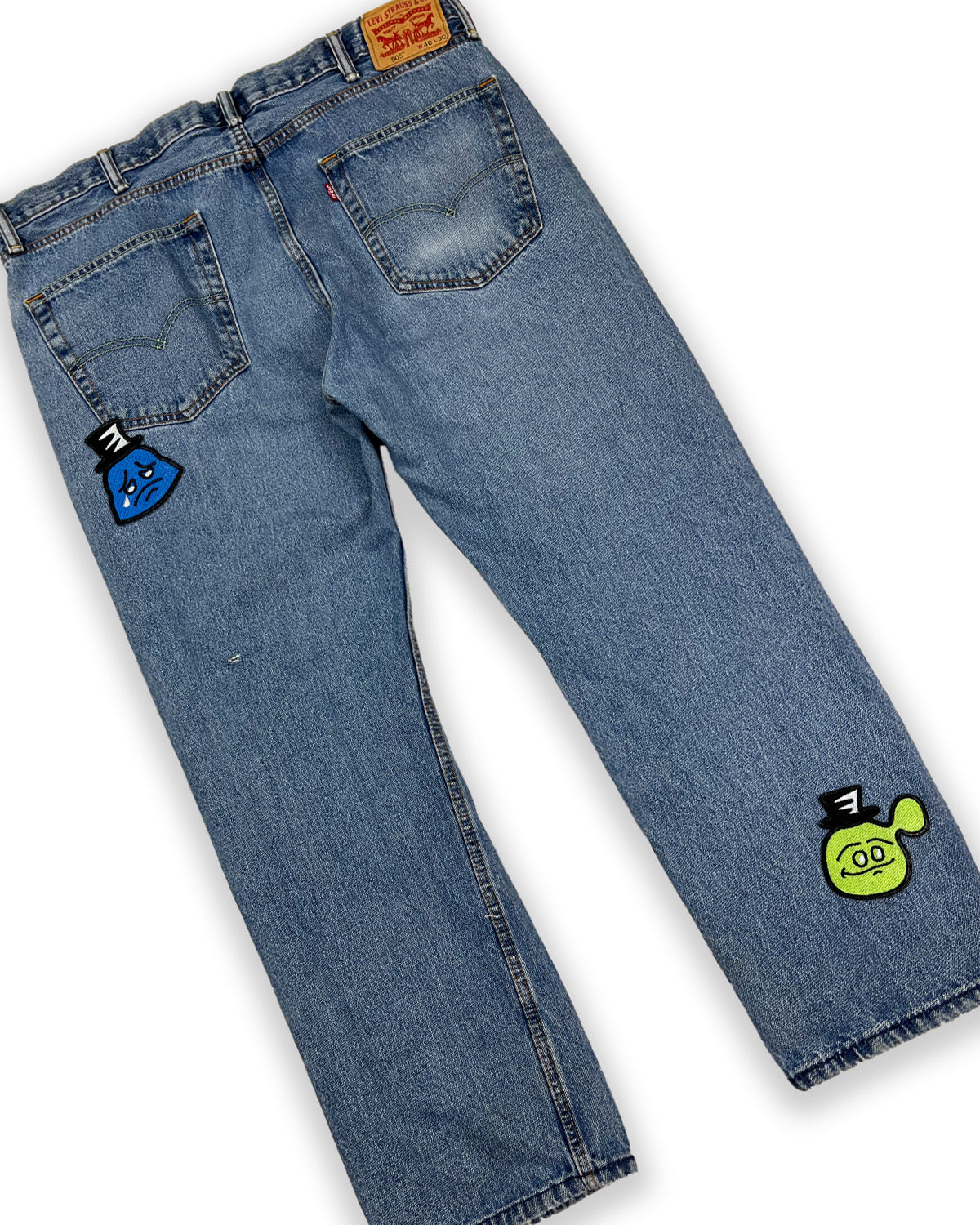 Denim Pants with Random assortment of Embroidered Shapes of Bop Patches sewn on top