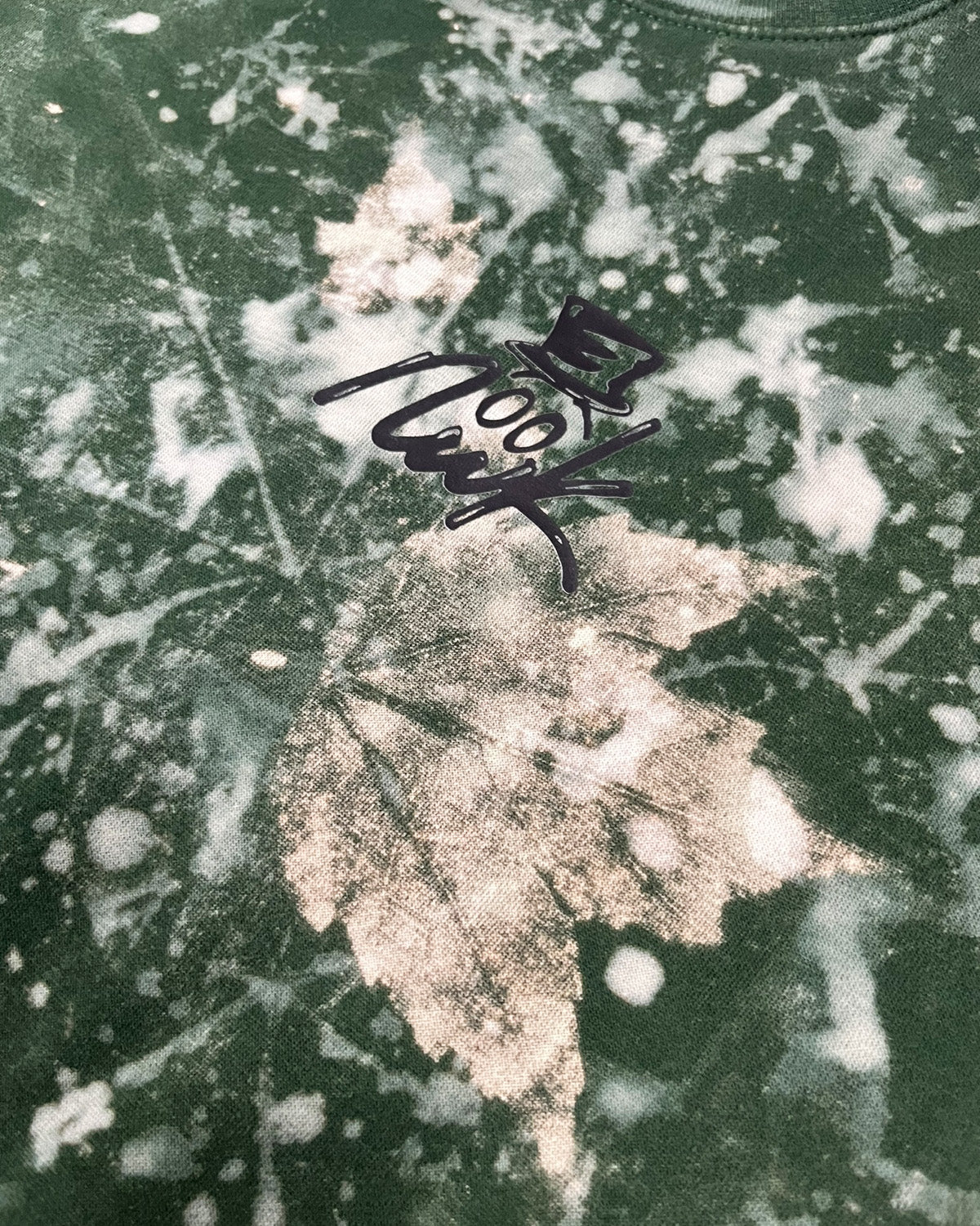 Forest green crewneck bleached with tree leaves and NWK dtf printed on front left chest